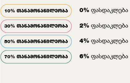 პირველადი შენატანი ღირებულების 10%, მშენებლობის პროცესში შენატანი 30%, მშენებლობის დასრულების შემდგომ შენატანი 60%